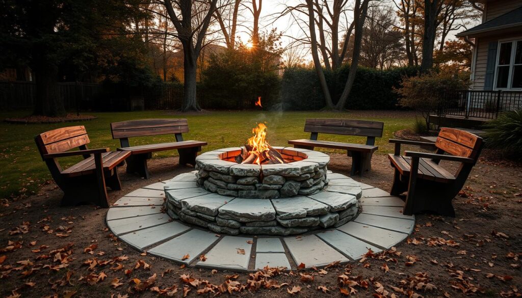 When planning your DIY fire pit, remember local rules and safety tips. Make sure the fire pit is far from buildings, trees, and other things that can catch fire. Also, think about the pit’s size and shape, and any features around it, like seats or a grill.