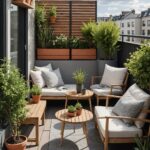 A simple yet effective privacy solution, this fence features dark green tarp stretched between wooden posts. Ideal for small urban gardens, it pairs well with raised planter beds and handmade wooden benches for a practical yet charming look.