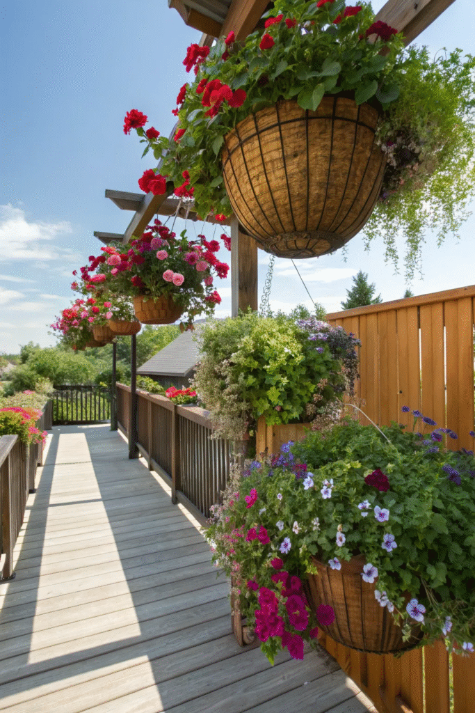 Suspend baskets brimming with trailing plants to amplify visual depth and charm. My hanging baskets are overflowing with lively flowers, instantly drawing attention.