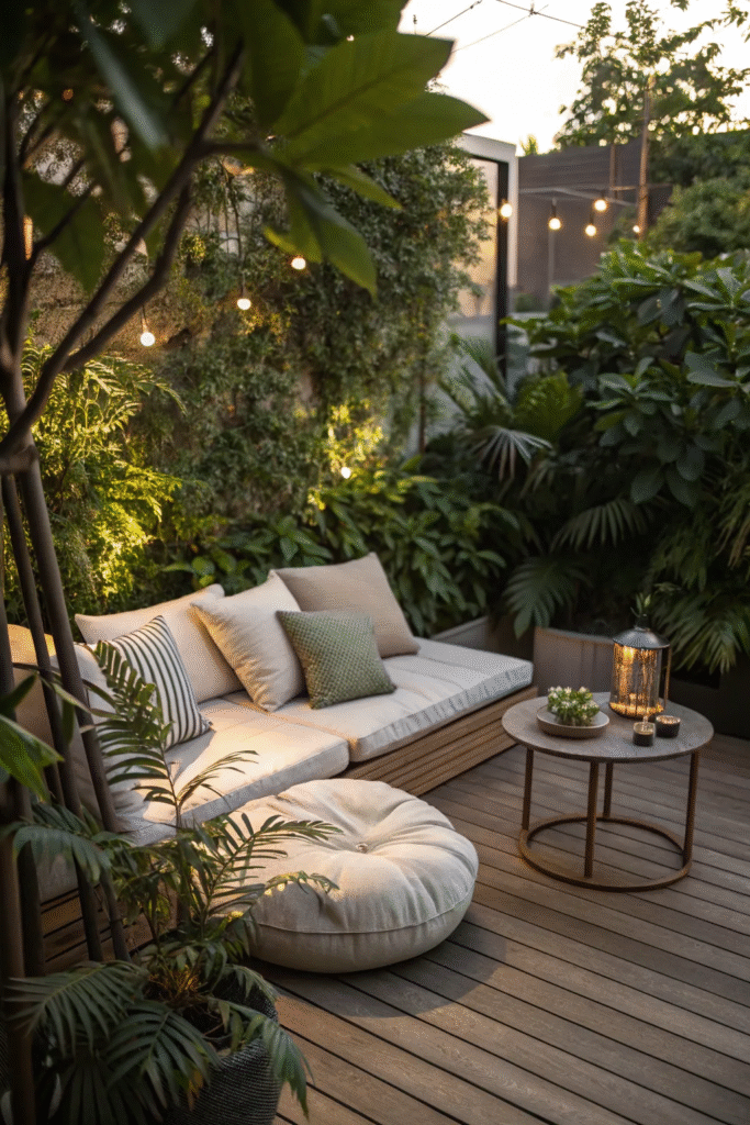 Develop a snug seating area with comfortable cushions and a petite table for leisurely weekend enjoyment. I cherish my deck’s seating arrangement as the perfect spot to relax with a captivating book and a warm beverage.