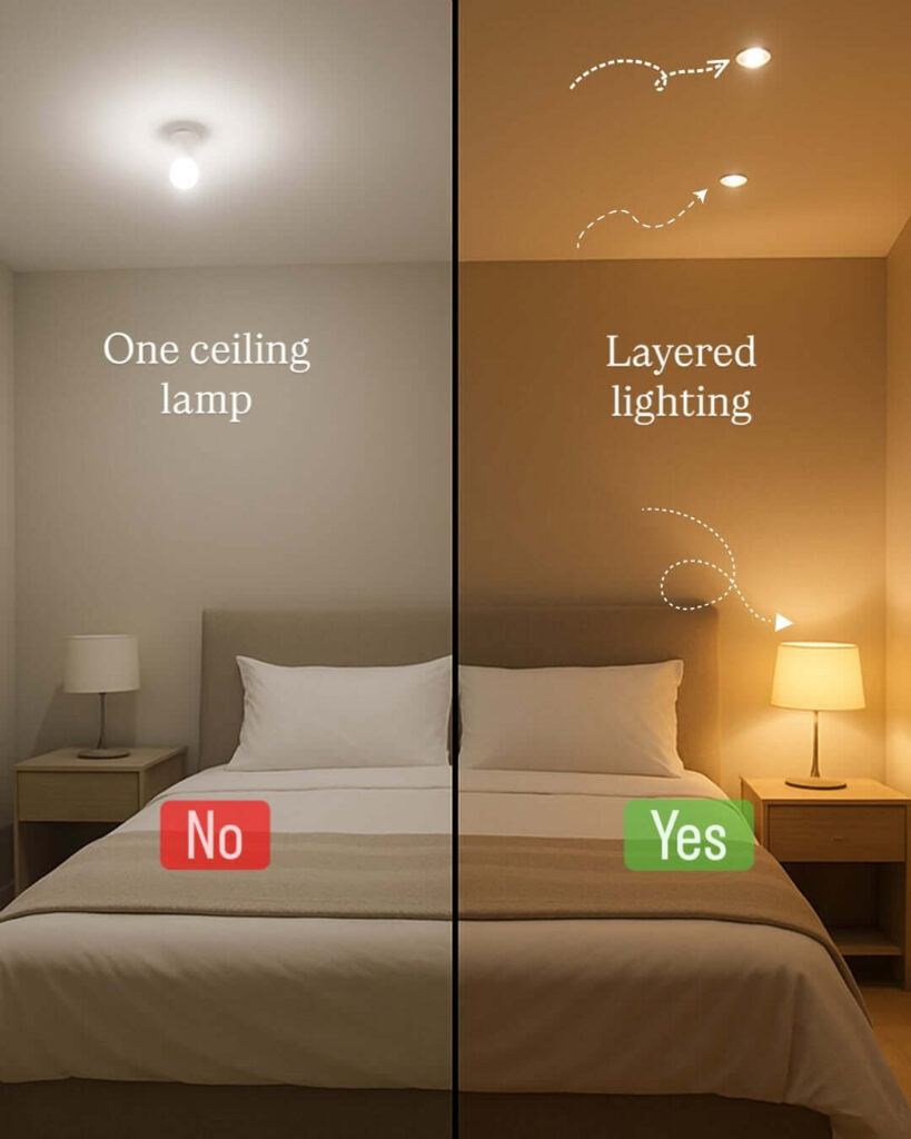 Compare that to layered lighting; a mix of ceiling spots, table lamps, and wall glow, and suddenly the room feels warmer, deeper, and more open.